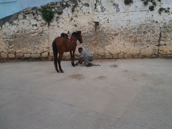 «En este taller yo recibo los animales, reviso las herraduras y con un cuchillo afilado renuevo los cascos ,caliento la herradura de acero a un calor infernal, hasta que se pone al rojo vivo, enseguida, sin ninguna piedad, tomo el martillo y le aplico varios golpes, hasta que la pieza adquiere la forma deseada, luego la sumerjo en un balde de agua fría, y el taller se llena de vapor, a causa del cambio de temperatura, hasta que quede lista para ponerlas en los renovados cascos de los pobres animales».